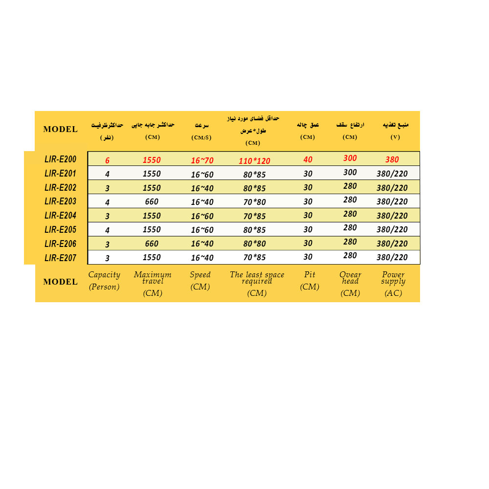 آسانسور الکتروهیدرولیک مدل LIR-E200 دارای موتورخانه پرقدرت هیدرولیکی با قابلیت تولید در ابعاد های مختلف بسته به محیط و درخواست مشتری ارائه می گردد و از جمله ویژگیهای آن حرکت نرم و بدون شوک حرکتی هنگام استارت و توقف بوده که خود این مسئله همواره دغدغه بسیاری از طراحان آسانسور برای ارائه یک حرکت کیفی مناسب بوده است .