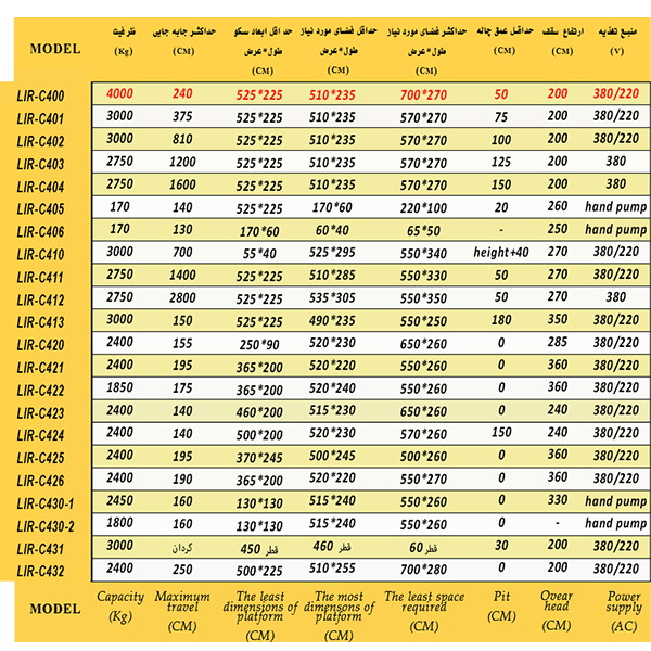 خودروبر مدل LIR-C400 در دسته ماشین برهای قیچی ( scissor ) و جهت حمل کلیه خودروهای سواری و SUV می باشد .
