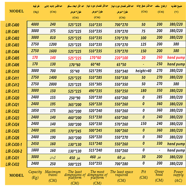 بالابر مدلLIR-C405 در دسته بالابرهای قیچی ( scissor ) و متشکل از دو بخش هیدرولیک و مکانیک فاقد موتورخانه بوده و مورد نیاز آن تعمیرگاه ، خطوط تولید ، نمایشگاه های موتور سیکلت و حتی کلیه فروشگاههای ماشین آلات کوچک می باشد .